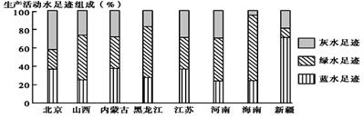 4、单选题 生产活动的水足迹是指支持一个国家(地区)在其本地进行产品生产与服务供给的过程中所需要的淡水资源量。绿水足迹指产品(主要指农作物)生产过程中蒸腾的雨水资源量,对农作物而言是指存在于土壤中的雨水被蒸腾的量。蓝水足迹指在产品生产过程中消耗的地表与地下水的总量。灰水足迹指以现有水环境水质标准为基准,消纳产品生产过程中产生的污染物所需要的淡水量。读我国部分省、市、自治区生产活动水足迹组成示意图,完成下列问题。。