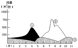 本题解析:试题分析:根据图示不同水源补给的大小和时间的差异分析,图示②补给量大,且主要分布于夏季,故判断为夏季降水;①主要在春季形成补给,故判断为春季的积雪融水;而③补给终年较稳定,故判断为地下水补给。该河流受夏季降水和春季积雪融水补给而形成双汛,故判断此河位于我国东北地区。