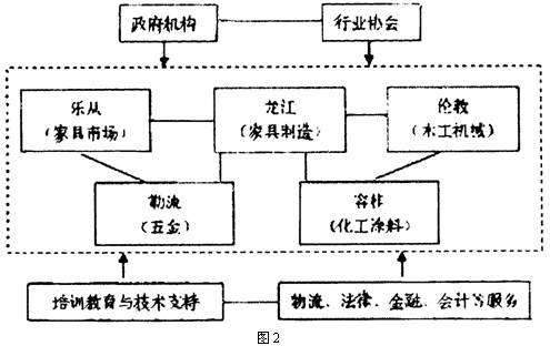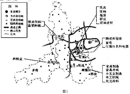 2、综合题 图1为广东省佛山市产业分布示意图,图2为佛山市顺德区家具生产专业镇联系示意图。读图回答问题。