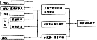 (1)某地理兴趣小组为探究图示区域每年防洪压力较大的原因,绘制了下列框架图,请帮助完成。