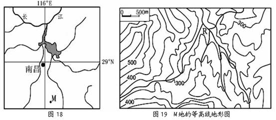4、综合题 图18为我国某区域的水系分布示意图。某学校研究性学习小组对图18中的M地进行实地考察,并查阅了相关资料,发现近三十年来M地生态环境明显改善。图19为M地的等高线分布图,表1为M地的土地利用结构变化表。根据图表回答问题