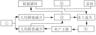 本题解析:试题分析:根据图示的生态环境各个要素的相互影响、相互制约分析,④由于水土流失而导致,进而导致了粮食单产下降,故判断为土壤肥力下降。