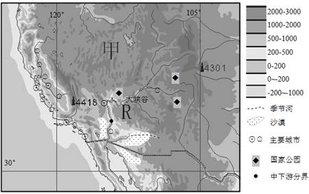 R河塑造了世界著名的大峡谷,峡谷平均深度达1600m。R河中上游地区年降水量约为250~500mm,下游地区年降水量一般不足100mm。甲国在R河干支流上修建了近百座水库和大型引水工程。促进了该国西部的城市和工农业的发展。