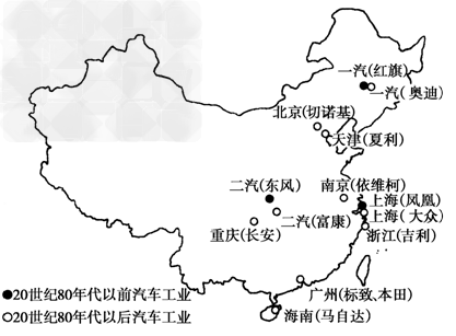 5、综合题 据中国汽车工业协会公布的最新数据,2009年我国国产汽车产销分别为1379.10万辆和1364.48万辆,而2009年美国汽车销量仅为1043万辆,这意味着我国首次超越美国,成为世界汽车产销第一大国。结合我国的汽车产业分布变化图,回答下列问题。??