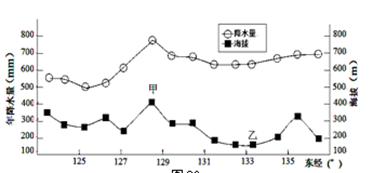 本题解析:试题分析:小题1:由经纬度可知图示地区是我国的东北地区。甲地海拔高,降水多,是大兴安岭附近,乙地海拔低降水少在东北 平原上,影响它们降水差异的主要因素是地形不同,B正确。