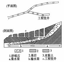 我国西北干旱地区的地下水,主要来自呈扇形分布于山前平原地带或山间盆地的冲积物中,冲积扇上部是良好供水源地。但是,在某些地区,冲积扇上部是大片的砾石戈壁,而下部能利用的地段,土壤往往产生严重的盐渍化现象。我国劳动人民为了解决这一矛盾,早在2000多年前的西汉时期就创建了一种特殊的引水工程——坎儿井。如下图所示,坎儿井由地下的暗渠和地面上的竖井、明渠、蓄水池组成。竖井是开挖地下暗渠的通道,暗渠与地下水流向斜交,上游挖至地下含水层中,渗溢出来的地下水顺着暗渠沿坡流出地面,明渠将暗渠流出的地下水引入蓄水池,蓄水池起了调蓄灌溉水量的作用。