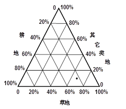 1.三轴坐标的读图须以每条横坐标的圆点位置确定相应的纵坐标,以与纵坐标平行的原则读数,故图示反映草地的沙化趋势严重,约占68%。