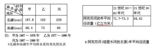 本题解析:小题1:根据图表信息可知,南疆比北疆降水少,丙时段南疆与北疆年平均降水量差异最大;该地河流的补给主要是冰雪融水补给。根据计算可知,降水的变化率南疆年平均降水量的增长率大于北疆。选择D项。