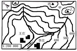 5、单选题 读等高线地形图完成下题。1.图中甲处表示2.量得乙丙两山峰图上距离为1.5厘米,则实地距离是3.流经王庄和李庄之间的小河流向是