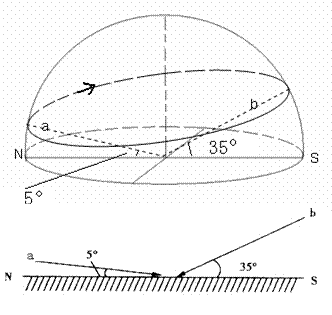 5、单选题 读下面两幅图,上图是某地一天中的太阳运动轨迹图,下图是从上图中截取的该日两个不同时刻太阳光线与地平面的夹角,据此回答各题。