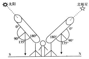 4、单选题 某中学一地理学习兴趣小组,用天文望远镜、指北针、半圆量角器、重力锤、无弹力绳,对本校农业生产实习基地进行地理位置测量。某日,该组成员用指北针观测到实习基地旗杆影子指向正北时,国际标准时间为7时40分,天文观测结果如下图。据此完成1~3题。