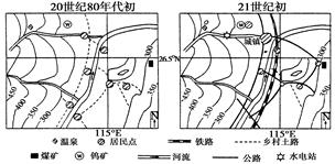 4、单选题 该图是某区域不同时期示意图。读图完成问题1.有关该区域20世纪80年代初聚落分布的叙述,正确的是2.下列不属于该区域20年来发生的明显变化是