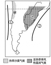 小题2:A项甲处热带沙漠气候的决定因素是由于位于回归线附近,终年受副热带高压控制;错误。B项,甲处气候呈狭长分布主要是受地形影响;错误。C项②表示暖流影响,故对乙处气候增温增湿;正确。同理D项错误。