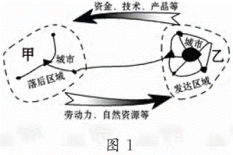 本题解析:小题1:由图中可知发达地区向落后地区输出资金、技术和产品,落后地区向发达地区输出劳动力和自然资源,两个区域之间相互联系,相互影响。