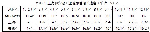 (1)比较2012年上海和安徽工业增加值的变化特点。(3分)