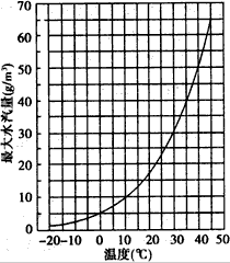 1、根据上图,气温在10℃时,1m3空气所能容纳的最大水汽量为10g,若要使最大水汽量上升到40g,气温应达到