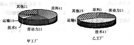 1、单选题  读“某地甲、乙两工厂万元产值主要成本百分比图”,判断回答问题。