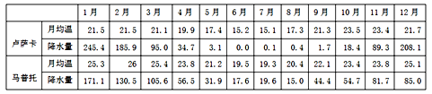 材料二: 卢萨卡(气象站位置:15.3°S,28.4°E,海拔1154米)与马普托(气象站位置:25.9°S,32.6°E,海拔44米)气候资料表