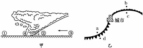 小题2:①地因离锋面较远,受冷气团影响不明显,故①地气温最高。④地未来将受冷气团控制。乙图中a、b两地可能形成降水,c、d两地处在暖气团控制下,天气晴朗。城市因处在气旋中心区域,盛行上升气流,易形成阴雨天气。