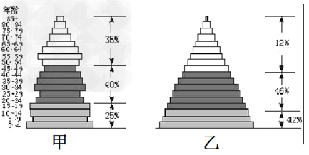 2、单选题 图为“甲、乙两国人口年龄结构金字塔图”。图中分别反映了两国不同性别、不同年龄阶段的人口占总人口的百分比。读图完成1—2题。