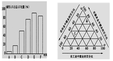 1.在左图中,字母A—E反映的现象是:2.右图中甲、乙表示不同城市化阶段的就业比重状况,其中甲处于: