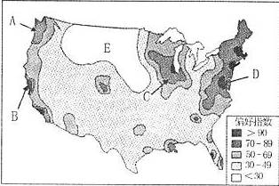 小题1:图字母所示地区中,受惠于电子信息等高科技产业的发展,以及宜人的气候,而成为美国在大学生心目中最偏好的居住及工作之一的城市位于?????????????????