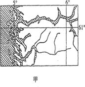 本题解析:本题考查世界区域地理比较分析。小题1:结合甲图的经纬度位置判断为斯卡的纳维亚半岛,由于西欧海岸线曲折,故利用盛行西风深入,而使当地的温带海洋性气候范围广。