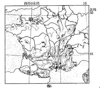 3根据水系形态等分析,该国流经甲、乙、丙、丁4地的河流中最可能出现断层河谷的是(???)