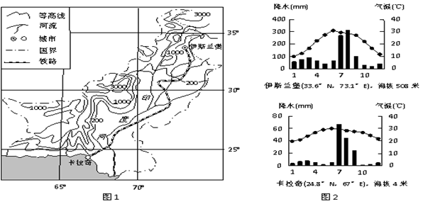 3、综合题 图1为巴基斯坦略图,图2为伊斯兰堡和卡拉奇两城市的气候资料。完成下列问题。