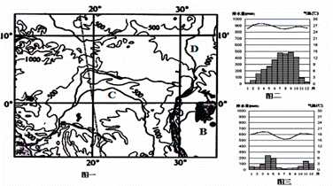 2、综合题 读某大洲部分地区地形图(图一),气候资料图(图二、图三),回答问题