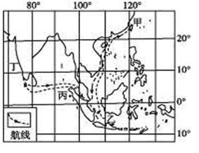 本题解析:试题分析:小题1:北印度洋地区冬夏季风风向不同,因而形成季风环流。夏季,该区域盛行西南风,在其影响下海水向东流。冬季,该区域盛行东北季风,在其影响下海水自东向西流。而图示从乙到丙需要借助夏季的东南信风,从甲到丁需要经过1年半。故选C项。
