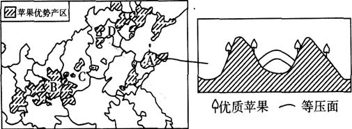 2、综合题 (22分)充分认识区域地理特征,因地制宜开发区域优势资源,发展经济,保护生态,有利于促进区域可持续发展。左图是我国北方苹果优势产区分布图;右图是A地某村优质苹果和白天等压面分布示意图。读下图,回答问题: