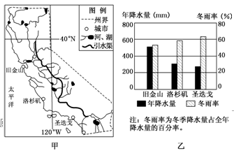 3、单选题 图甲是世界某区域图,图乙是图甲中三个城市的年降水量和冬雨率柱状图。