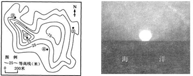 3、单选题 李教授于北京时间10:20从杭州(120°E、30°N)出发去太平洋某岛进行野外考察,飞机飞行了7小时40分钟到达该地,当地时间为23:20。所给图中左图为该岛等高线地形图,岛上①处有一面彩旗,常年向东南方向飘扬。读图回答问题。1.李教授所考察的岛屿的经度位置是2.右图是李教授在图中④处考察时拍摄的太阳照片,拍摄时当地时间最可能是3.图中①、②两处高差可能为