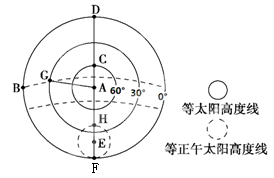 【小题1】从等太阳高度线的分布状况看,A点为直射点,F点所在的等太阳高度线为晨昏线,图中A点的纬度是15°S,F点的纬度为75°S。A点与F点的经度相差180°。北京时间21时,F点0时,因此F点的经度为165°E,答案选D。