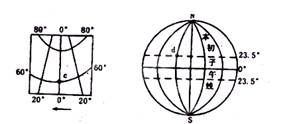 【小题2】c点位于0°经线,区时为6月22日4时,则6月22日0时位于西四区,即60°W,故全球两个日期的分界线为60°W和180°经线。