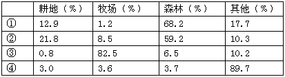 小题3:表格①②③④代表阿拉伯联合酋长国、柬埔寨、日本、蒙古四国的耕地、牧场(牧草地)、森林等用地占国土面积的比例。①②③④代表的国家分别是