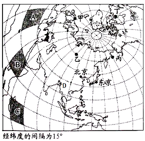 小题1:从图中的东京看北京,方位与距离组合正确的是??????????????