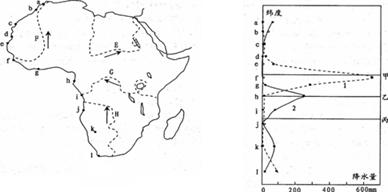 5、单选题 下左图中a—l表示非洲西海岸地带的城市。右图中折线1、2表示这些城市1月与7月的降水量分布,甲、乙和丙中的某一条直线表示赤道。据此回答1—2题。