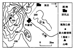 【小题1】在图示区域内,拟建一座防火嘹望塔,在①②③④选址方案中,嘹望范围最大的是( )