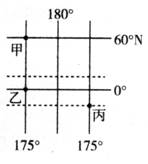 5、单选题 如图中,甲、乙、丙三艘船同时出发沿纬线驶向180°经线,而且同时到达,速度最快的是(???)