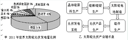 1、单选题 光伏发电是利用半导体界面的光生伏特效应而将光能直接转变为电能的一种技术,其关键元件是太 阳能电池, 其 产业链的产品具有轻、薄、短、小的特点。读图完成下列各题。