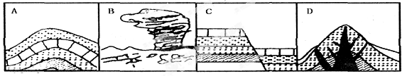 本题解析:试题分析:A图中岩层弯曲,是内力作用中的水平挤压所形成的;B是风力侵蚀作用所形成的风蚀蘑菇,由外力作用所形成;C图中岩层出现断裂错位,是内力作用中的地球垂直运动所形成的;D是火山,是内力作用的表现形式。