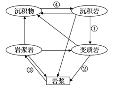 小题2:若图示为地壳物质循环示意图,甲为岩浆,乙为变质岩,则丙代表岩浆岩,丁代表沉积岩,③代表变质作用,①代表重熔再生,②代表冷却凝固。