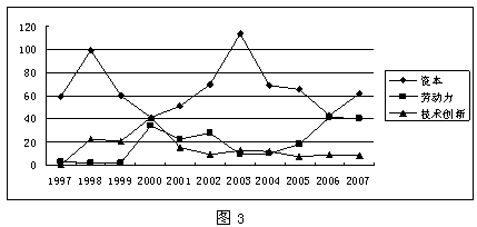 (4)结合材料二描述江苏省1997—2007年资本、劳动力、技术创新等因素对经济增长贡献率的变化特征。