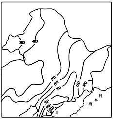 1、单选题 读东北地区年降水量分布图(单位:mm),完成1—2题。