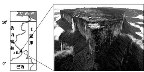 下图中A山海拔2180米,具有顶平、坡陡的外观特征。A山顶部长约14千米,宽约5千米,主要由砂岩构成;山下生气盎然,猴子的吱吱叫声和金刚鹦鹉的鸣声此起彼落,四周覆盖着棉花糖般的云,边缘攀爬着前所未见的热带植物,上百条瀑布飞溅.