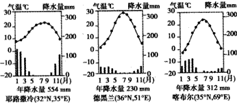 2、单选题 下图为西亚三个城市的气温、降水量图。完成1—2题。
