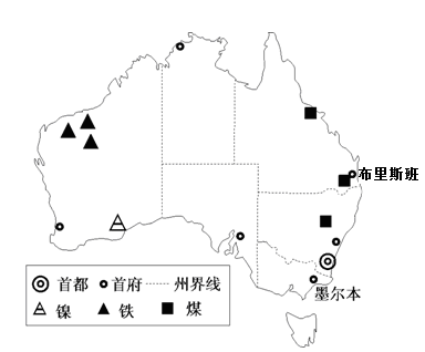 单选题 2011年1月,澳大利亚第三大城市、昆士兰州首府布里斯班(年平均降水量1153mm,大部集中在12月至翌年3月)遭遇了史上最惨重的洪灾,肆虐数周的洪水造成了重大的财产损失和人员伤亡,并对国际市场上的部分商品价格造成较大的波动。图为澳大利亚主要城市和矿产资源分布图。完成下列各题。