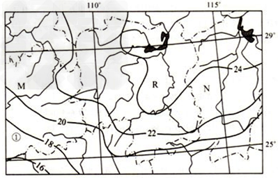 材料一:我国某区域气温年较差(单位:℃)分布图。?材料二:图中M、N两省(区)土地面积和耕地面积统计表。?